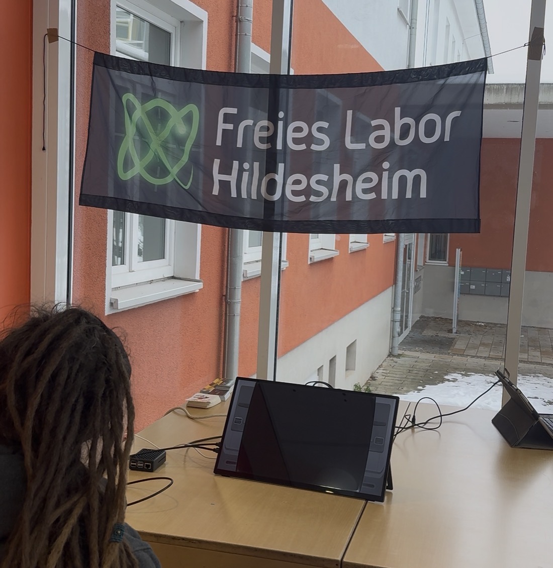 Stand des Freien Labors HildesheimIm Jugendtreff konnten alle Interessierten Wünsche für die nächste Veranstaltung am 1. März auf eine Tafel schreiben oder kleben und über die Präsentation ins Gespräch kommen.